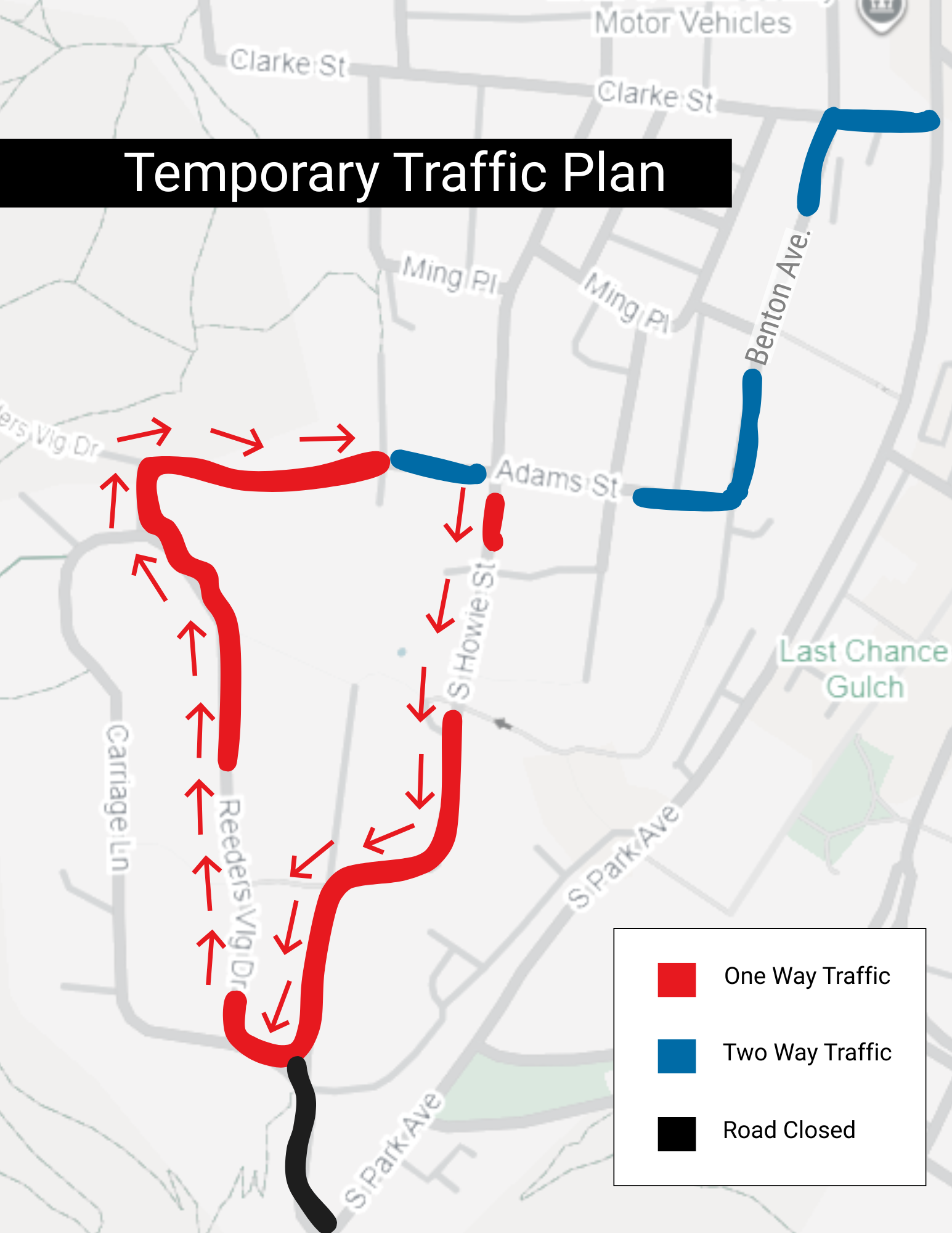 This project will require the temporary closure of the lower section of Carriage Lane, requiring traffic in the Reeder’s Village neighborhood to reroute using Howie St. for ingress and Adams St. for egress. Traffic flow signage will be posted throughout the neighborhood and along the detour route. Emergency services access will remain available. Staff do not anticipate water service interruptions to homes in the area. Though the Mount Helena Trailhead will remain open during construction, city trail users are encouraged to access Mt. Helena City Park via Dump Gulch, Tubbs, or Le Grand Cannon Trailheads to ease traffic congestion.